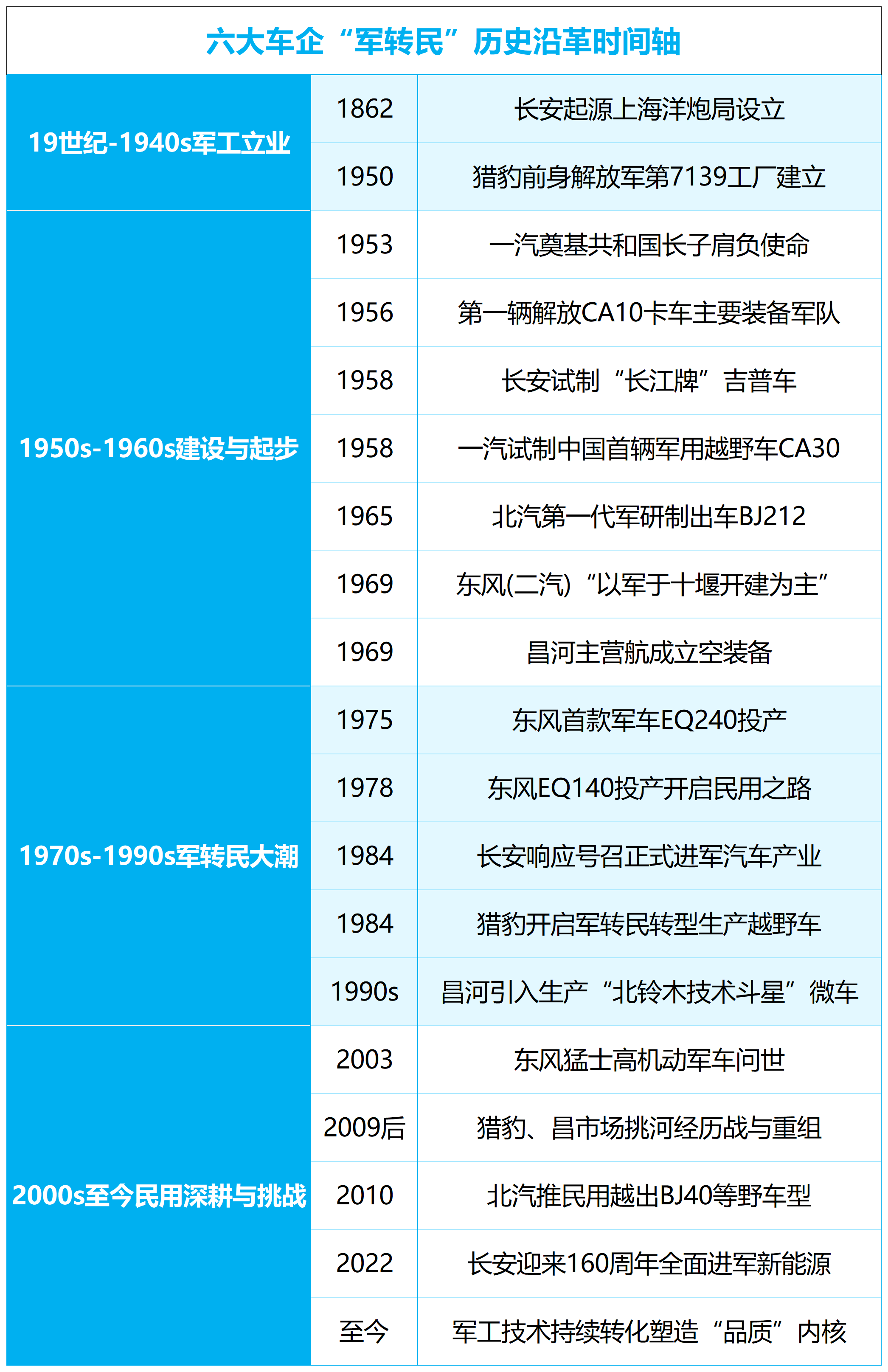 要理解这批企业的独特之处,最好的方式是将它们置于历史的长河之中。下面的时间轴清晰地勾勒出六家代表性车企,如何在一个半世纪的时间里,共同谱写从“军”到“民”的宏大叙事。